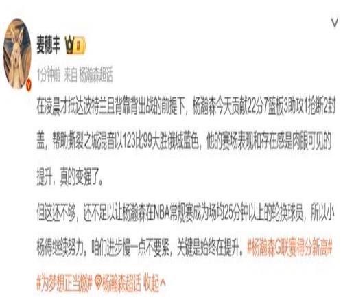 麦穗丰:杨瀚森22+7+3+1断2帽,他的赛场表现与存在感肉眼可见的提升,真的变强了。但这还不足以让他成为NBA常规赛场均25分钟以上的轮换,小杨还需继续努力。