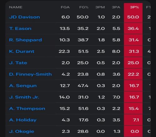 火箭球员近6场三分命中率:伊森36.4%杜兰特31.3%小贾16.7%